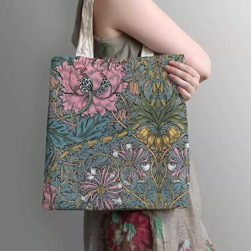Design Morris Pink Honeysuckle: Inspirada no renomado artista William Morris, esta bolsa apresenta uma versão em rosa e pastel do seu icônico design. A arte é uma celebração de beleza e natureza, refletindo a essência do movimento Arts and Crafts.