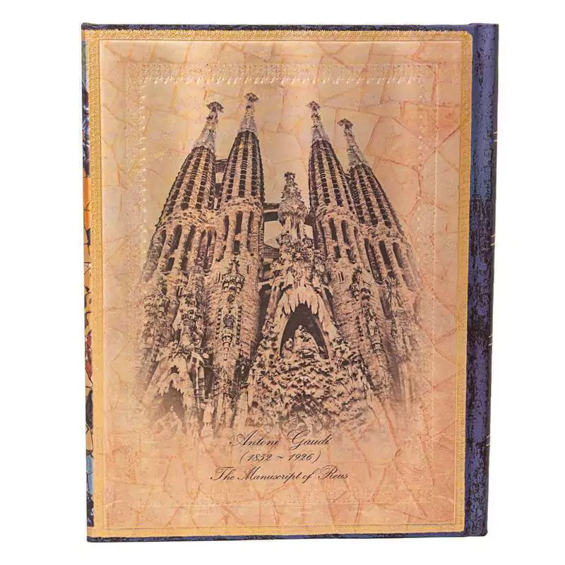 Antoni Gaudí foi um arquiteto espanhol conhecido como uma figura de destaque no Modernismo. Seu estilo é caracterizado pela representação de formas orgânicas e mosaicos extraordinários. Reproduzido aqui está o Manuscrito de Reus ao lado de mosaicos de sua icônica escultura de salamandra e uma imagem da Basílica de la Sagrada Familia.